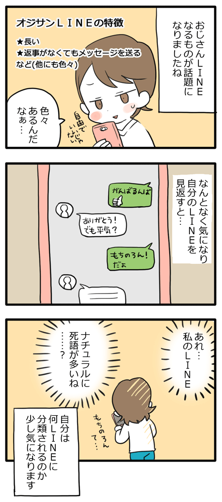 2017年12月11日 あなたは何LINE? あなたは何LINE? 私は『古き良き時代のはやり言葉を愛用する』LINEとか ポジティブな感じにカテゴライズされたいです(´▽`) しかし無意識に「もちのろん」とか言ってて 我ながらちょっとびっくりしました笑 がんばるんばといい、ポロっと言い続けてしまいそうです。 -------------------------------------------------------- タグ :#コミックエッセイ#絵日記#死語#おじさんLINE#LINE スポンサーリンク 「日常」カテゴリの最新記事 < 前の記事次の記事 > コメント コメントフォーム 名前 コメント 記事の評価 リセット リセット 顔 星 情報を記憶 コメントを投稿する